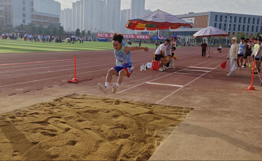 11月15日上午,我校第二十五届校运会男子甲组跳远决赛在我校东校区新田径场火热进行。