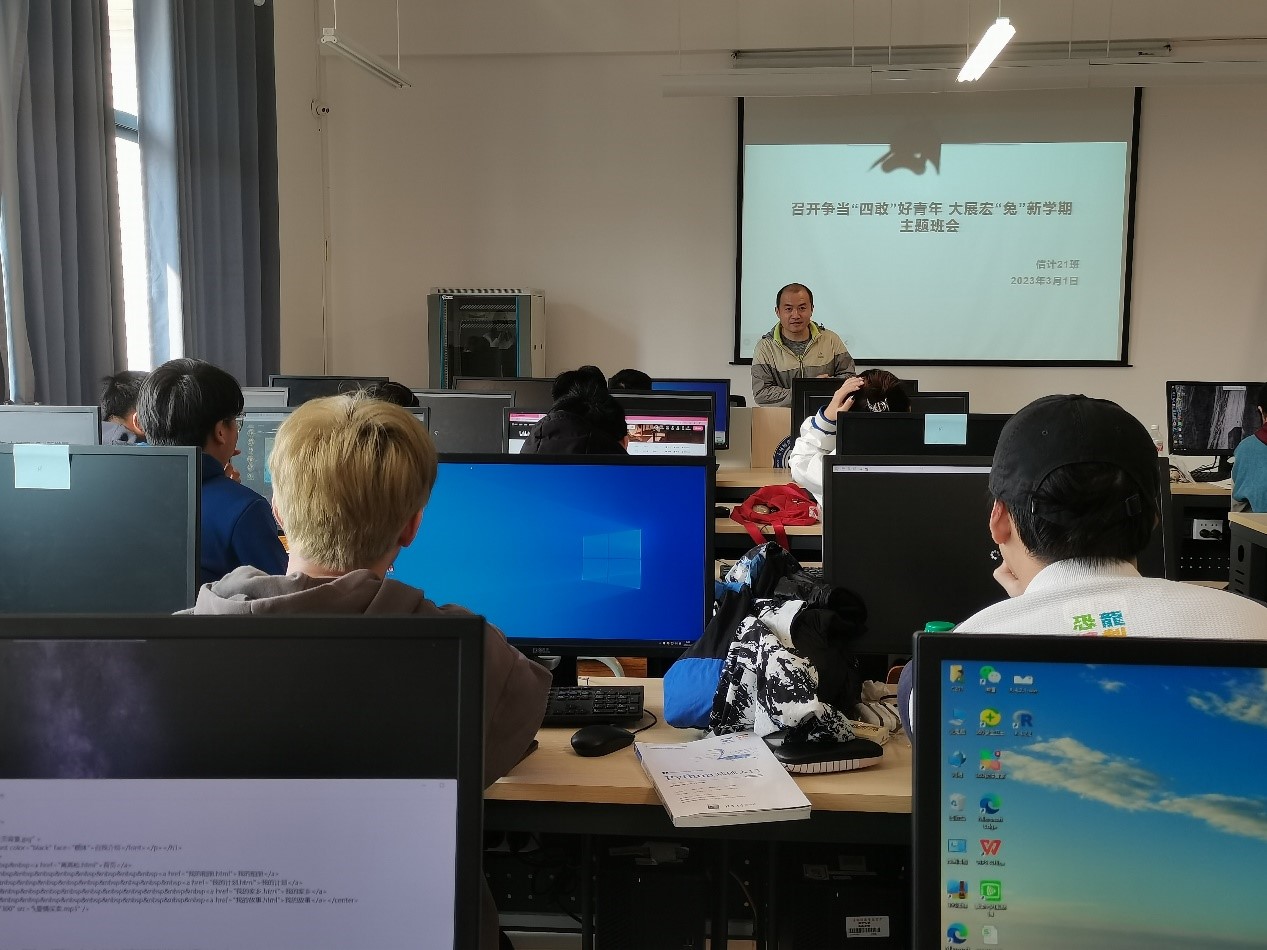 信计21班班主任冯震老师教育学生在日常生活中要注意人身安全、饮食安全和交通安全等。强调要制定复习计划,认真备考,杜绝舞弊行为,争取考出好成绩。教育引导学生积极报名参加“挑战杯”、“互联网+”、大创项目申报等创新创业竞赛,争取在新学期取得更大进步。