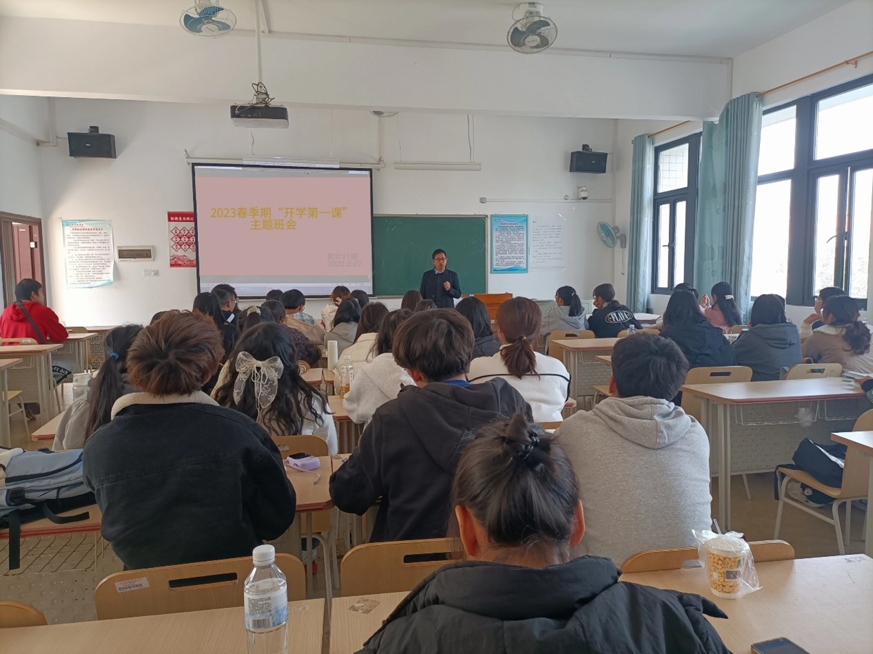 统计21班班主任吴荣火教育学生要自觉遵纪守法,加强思想道德建设,用积极的心态对待新学期的学习与生活,保持良好的卫生习惯,并且提醒学生注意食品安全和交通安全。吴荣火强调学风建设的重要性,要求学生注意考试时间,积极备考,规划好新学期的学习目标,合理利用时间。