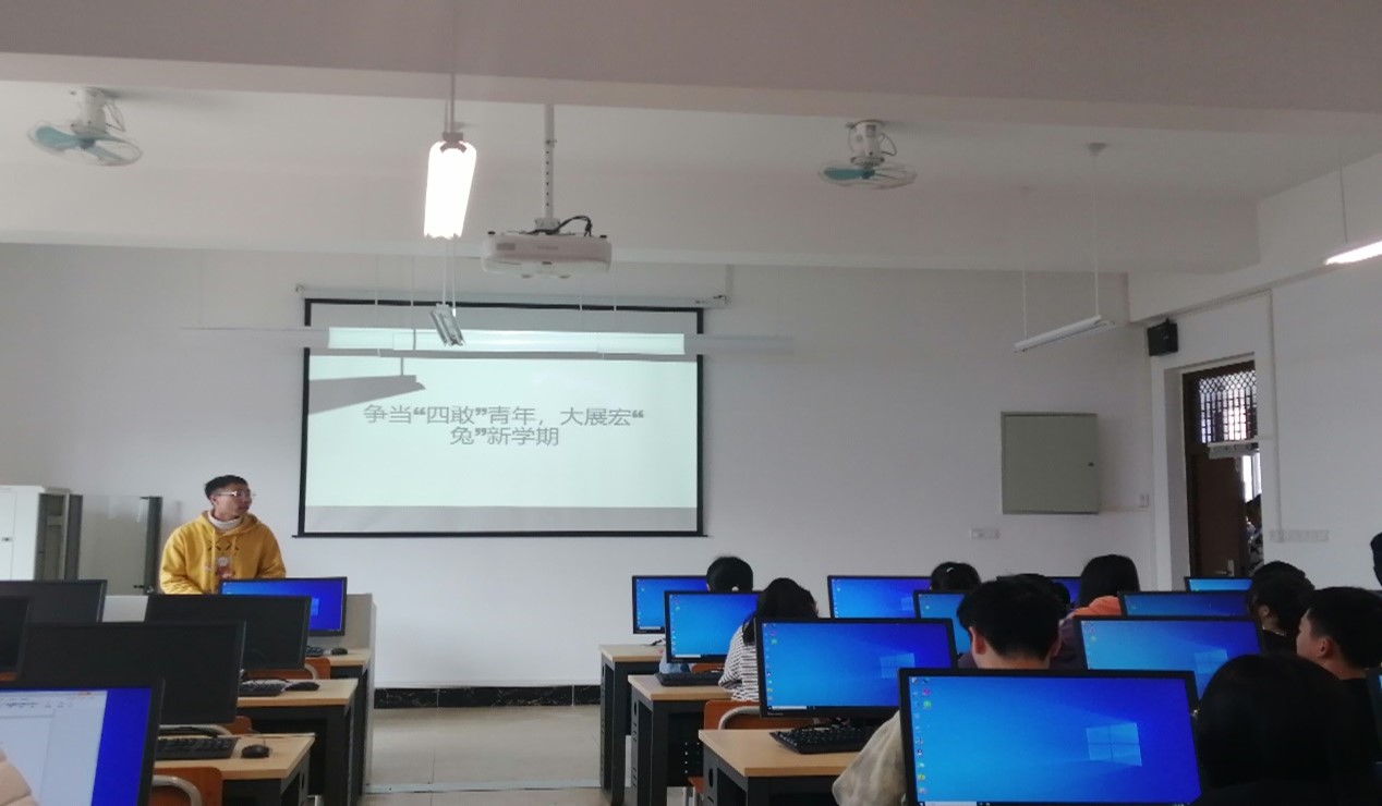 数学202班班主任廖珊莉说明召开主题班会的意义及目的,要求学生自觉遵纪守法,遵守道德规范,提高自我保护意识,自觉维护学校和大学生形象,营造良好的学风、院风。廖珊莉对学生进行考风考纪诚信教育,并鼓励学生积极考研考证,激励学生在新学期能争当“四敢”好青年,大展宏“兔”!